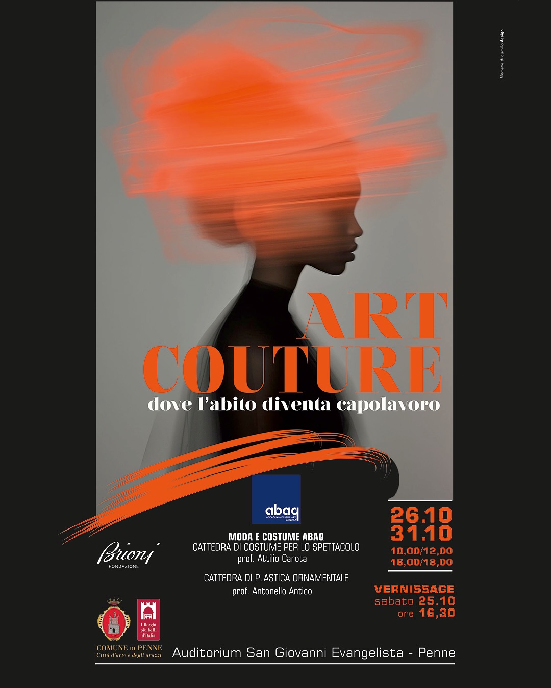 Una mostra di abiti che si ispirano all'arte è un'esposizione affascinante che celebra il dialogo e la fusione tra due mondi apparentemente distanti ma intrinsecamente connessi: la moda e le arti visive. La mostra si terrà nell’Auditorium Giovanni Evangelista, nel cuore del centro storico di Penne, dal 25 al 31 ottobre prossimi. La cerimonia di inaugurazione è in programma sabato 25 ottobre, alle ore 16.30. “Non si tratta semplicemente di esporre capi di abbigliamento, ma di presentare vere e proprie opere d'arte indossabili, dove il tessuto diventa tela e l'ago si trasforma in pennello. Abbiamo messo in campo una sinergia tra Fondazione Brioni e ABAQ per coniugare l’artigianato sartoriale e formazione”, ha commentato il sindaco Gilberto Petrucci. "Art Couture" presenta quaranta capi in relazione tra loro, frutto della ricerca e della creatività degli studenti dell’indirizzo Moda e Costume ABAQ. Un elemento di particolare rilievo è la sinergia raggiunta dagli studenti attraverso una stretta collaborazione tra il Corso di Moda e Costume dell'ABAQ e la prestigiosa Scuola di Alta Sartoria Nazareno Fonticoli, promossa dalla Fondazione Brioni. Inoltre, tra le creazioni spicca un abito unico che ripropone la celebre opera "L'età dell'oro" (Afro Basaldella, 1975), celebrando i cinquanta anni dalla sua creazione. Questo capo sottolinea il legame profondo tra la moda, le arti tessili e la storia culturale del territorio abruzzese.